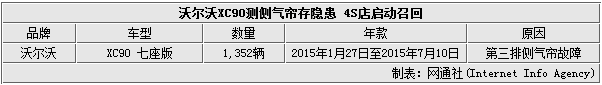 根据质检总局公布的信息,此次召回车型为7座版XC90(T6智雅版-7座、T6智逸版-7座、T6智尊版-7座)。其生产日期区间是2015年1月27日至2015年7月10日,共计1,352辆车。