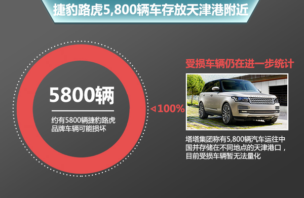 在此次爆炸之前,天津地区一直都是国内最大的进口车港口,每天有大量的进口车辆从此进港,同时也有不少车在此存放。在此次事件中,由于爆炸威力极大因此在天津港及周围大面积都受到影响,停靠在港口的进口车自然无法逃脱。对于车辆的受损数字,捷豹路虎官方人士表示:“目前暂时没有相关信息。”有业内人士分析称,在此次爆炸中有不少车辆均接近报废的情况,很难对其进行修复,因此涉及此次爆炸的车辆数字需要一段时间进行统计。