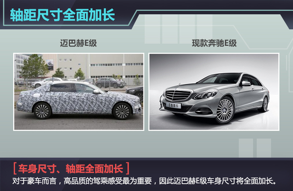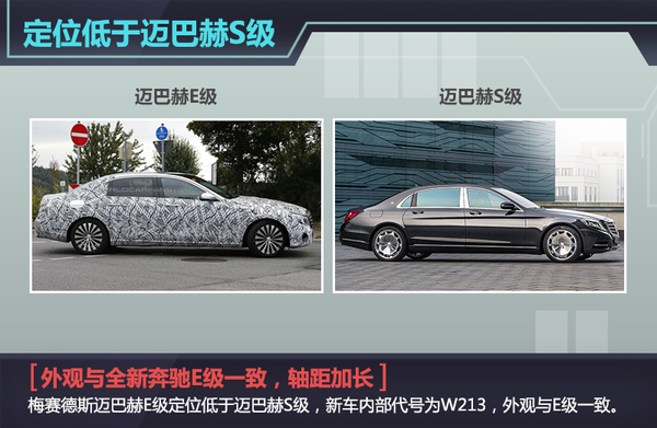 梅赛德斯迈巴赫E级定位低于迈巴赫S级,新车内部代号为W213,新车前脸部分设计与目前海外路试的新一代奔驰E级保持一致,但车身长度上则由明显加长,由于全新一代奔驰E级轿车尚未发布,但相信凭借新车所具备的卓越综合性能,并且经过迈巴赫品牌奢华、精湛的包装后,其豪华感及尊贵程度都将进一步提高。