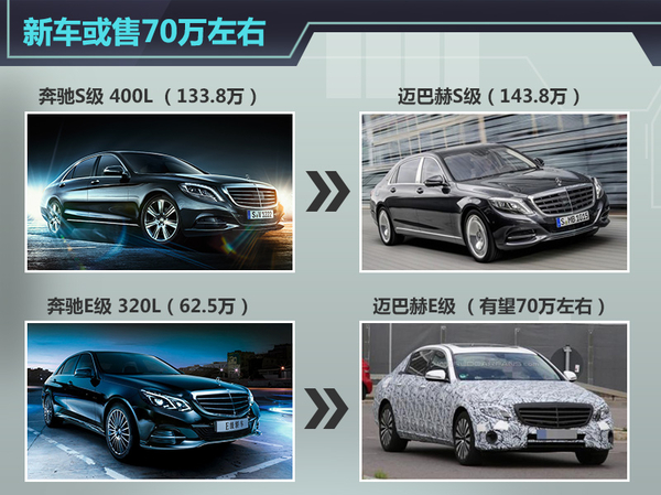 奔驰旗下梅赛德斯-迈巴赫品牌是一个主打奢华的高端品牌,此前推出的迈巴赫S级入门车型售价143.8万,相比奔驰S级400L 133.8万的售价高出约10%。现款奔驰E级320L车型售价62.5万,按照此前迈巴赫的定价体系,迈巴赫E级车型将入门售价或有望下探至70万元左右。