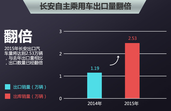 近年来国内自主品牌中发展势头较好的长安汽车,旗下车型受到了国内消费者的热捧,同时也吸引了来自大洋彼岸的消费者。2014年长安自主品牌乘用车海外出口销量达到了11,989台。日前,网通社从长安汽车官方获悉:长安汽车今年自主品牌车型出口目标销量是将较去年翻番,并且其中SUV车型将成为长安海外出口的主力军。