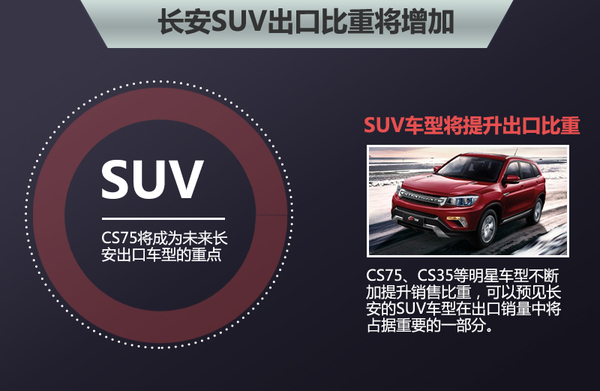 据长安汽车发布的数据显示,长安CS75车型1-7月累计售出9.81万辆,其中7月销量突破1.12万辆,同比增长111%,该车已经成为长安的明星车型。按照长安出口产品布局,CS75将成为未来长安出口车型的重点。另外像CS35这种热销的SUV车型也将不断提升销售比重,可以预见长安的SUV车型在出口销量中将占据重要的一部分。