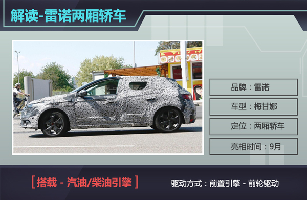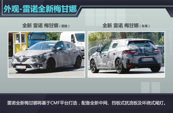 全新梅甘娜将基于雷诺-日产CMF平台打造,在外观设计方面,由于全新雷诺梅甘娜定位于五门掀背两厢车,因此在尾窗上缘所设计的扰流板将在视觉效果上为新车起到增分效果,而这款全新车型也将于下月开幕的法兰克福车展上首度亮相。