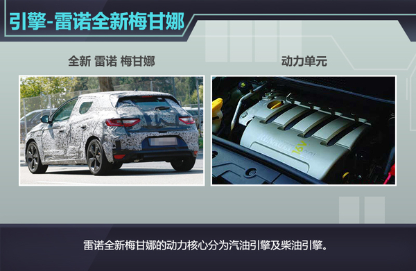 在动力方面,雷诺全新梅甘娜将搭载2款不同规格的引擎,分别为汽油动力及柴油动力。但值得一提的是:虽然柴油引擎的车款无论在油耗还是动力的输出特性方面均由于汽油引擎,但针对中国市场而言,未来引入国内销售的车款将为汽油版车型。