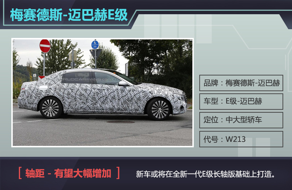随着梅赛德斯迈巴赫E级轿车的问世,梅赛德斯奔驰旗下的迈巴赫版轿车将再添新丁,相信这款定位略低于梅赛德斯迈巴赫S级的E级轿车将在问世后取得更好的销量,而这均得益于市场对标准版E级轿车的青睐程度以及轴距的增加。