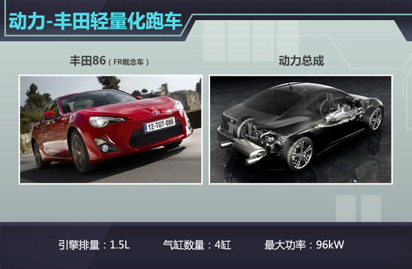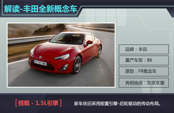 在动力方面,以FR概念车为基础打造的全新丰田86将搭载一台排量为1.5L的四缸引擎,虽然该款引擎的进气方式依旧为自然吸气,但得益于可变气门正时技术的应用,使得此款排量更低的1.5L引擎能够爆发出96kW的最大功率,而这款全新86的量产版车型也将于2017年正式亮相。