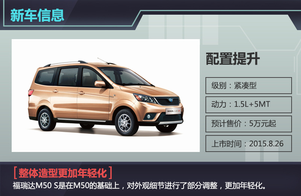 在2015年上海国际车展上,昌河携福瑞达M50升级版——M50 S首发亮相,并同期公布了部分车型参数。时隔四个月后,这款车将迎来上市。日前,网通社从昌河汽车官方获悉,福瑞达M50 S将于8月26日举行网络上市发布会,届时将公布该车的厂商指导价格。