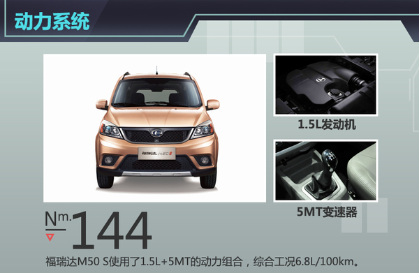 动力方面,福瑞达M50 S采用了直列四缸1.5L发动机,排放满足国IV标准,具备升级欧V能力,最大功率85kW,最大扭矩144Nm。传动系统方面,该车将全系配备5MT手动变速器。此外值得一提的是,在搭载上述动力组合的情况下,福瑞达M50 S的综合工况油耗为6.8L/100km。
