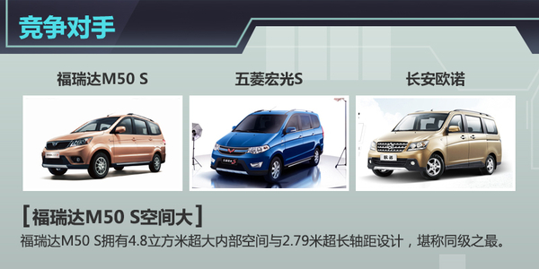 数据显示,福瑞达M50 S的车身长宽高分别为4525/ 1700/1818mm,轴距为2790mm。相比于同级竞争对手(五菱宏光S、长安欧诺、小康风光等),福瑞达M50 S可以说是全面领先。对于主打实用性的MPV车型来说,空间要远比动力、配置等方面重要。