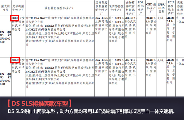DS 5LS是DS品牌首款三厢轿车,该车型定位在豪华紧凑级家轿市场,目前搭载了1.6T和1.8L两种不同排量发动机。近日,网通社从国家环境保护部获得DS 5LS车型的相关信息,DS品牌将推出两款配置不同的DS 5LS车型,将搭载代号6G01的1.8T涡轮增压发动机,与之匹配的是一台6速手自一体变速箱。动力储备方面,基本与搭载1.8T涡轮增压发动机的奥迪A3持平。