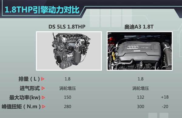 载1.8THP涡轮增压发动机的新款DS 5LS,在动力方面几乎与搭载的1.8T引擎的奥迪A3持平。新款DS 5LS的最大功率为150kW而奥迪A3仅为132kW,峰值扭矩方面奥迪A3则比DS 5LS增加了20N.m达到300N.m。新款DS 5LS在动力参数上虽然与奥迪A3持平。