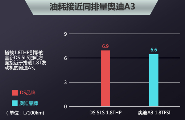 油耗方面,奥迪A3的百公里油耗仅为6.6L,比新款DS 5LS要少0.3L/100km,由于新款DS 5LS与奥迪A3的整体质量和市场定位不同,搭载1.8THP涡轮增压发动机的新款DS 5LS在百公里油耗方面达到6.9L也是可以接受的,并且新款DS 5LS在排量增加的基础上百公里油耗相比现款车型没有增加反而减少了,这也体现了1.8THP发动机运用更加新的引擎技术后的明显效果。(网通社2015年8月25日北京报道)