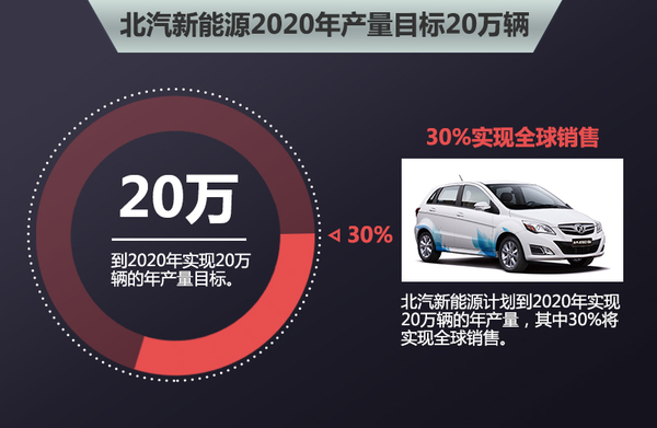 据北汽官方介绍,2015年上半年,中国已超越美国,成为全球新能源汽车第一大市场。其中北汽新能源今年1-6月销量为6223辆,占全国纯电动乘用车市场份额的23.1%,在中国纯电动汽车销量榜上位列首位,并高居全球纯电动销量第六名。据悉,北汽新能源计划到2020年实现20万辆的年产量,其中30%将实现全球销售。(网通社2015年8月25日北京报道)
