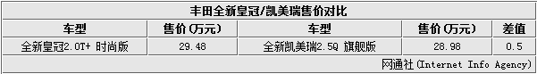 全新皇冠2.0T+时尚版/凯美瑞2.5Q旗舰版售价对比