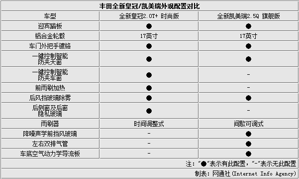 由于一汽丰田与广汽丰田官方公布的配置名称不尽相同,因此两车在配置对比中与实际情况有一定出入。从外部配置上来看,全新皇冠2.0T+时尚版与凯美瑞2.5Q旗舰版相比各有优势,全新皇冠更加偏向舒适,配有一键控制职能防夹车窗、后侧窗及后窗隐私玻璃等“软性”配置;凯美瑞则是在降噪、空气导流板等“硬性”配置上优势更加明显。
