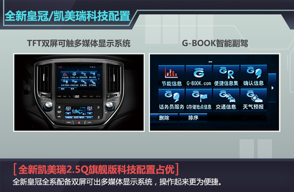 新一代皇冠的关键词是主打年轻化,因此在科技配置上显得更“潮”一些。全新皇冠配备了8.0英寸触摸屏、5.0英寸触摸屏、10扬声器环绕立体声高级音响系统以及G-BOOK智能副驾系统等多项科技性配置,但售价为29.48万元的全新皇冠2.0T+时尚版仅提供了7英寸+5英寸的TFT双屏可触多媒体显示系统,在科技性配置中,全新凯美瑞2.5Q旗舰版更加全面。经过比较之后,您会发现在选车过程中还是要最终根据自身需求来进行选择。(网通社2015年8月25日北京报道)
