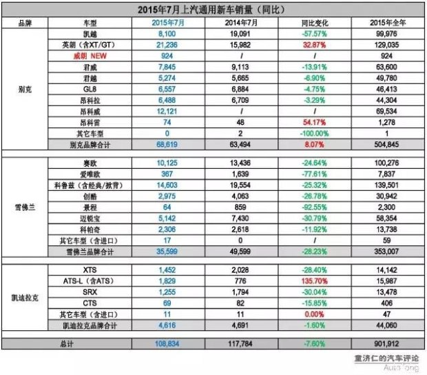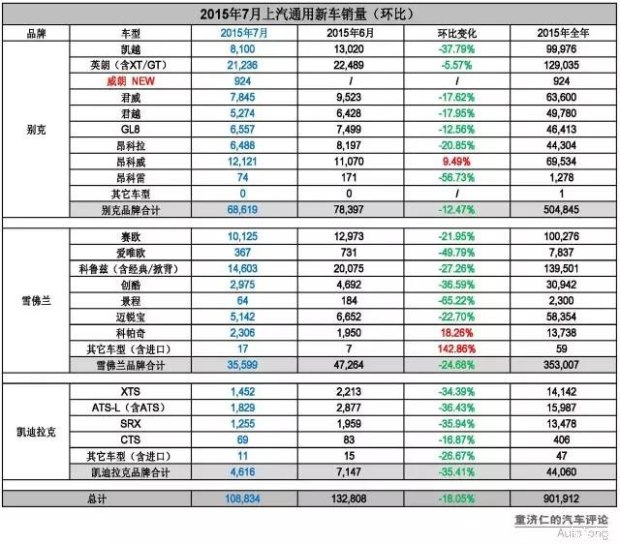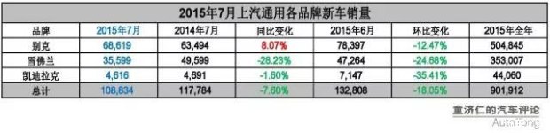 2015年7月,上汽通用实现终端新车销售108,834辆,排名单月车企销量第三名,同比下跌7.60%。其中,别克品牌同比去年仍有8%的增长,凯迪拉克品牌销量与去年同期基本持平,跌幅最大的,则是雪佛兰品牌(-28%)。