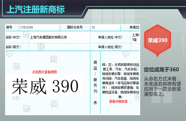 一直以来,荣威品牌都是以面向成熟用户群体的角色存在的,而荣威350则是其中当仁不让的热销车型。虽然该车迟迟没有进行换代,但是荣威“3”系车型却不会因此而丧失竞争力。日前,网通社从国家工商行政管理总局商标局获悉:上海汽车股份有限公司已经注册了“荣威390”商标。从命名方式来看,未来该名称将有望应用于一款全新紧凑型车上。如果算上即将发布的荣威360,荣威仅在该细分市场就规划有2款全新产品。