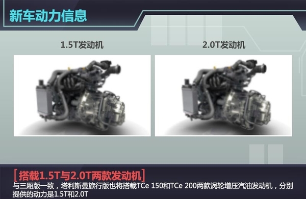 动力方面,塔利斯曼旅行车与三厢车相同,将搭载TCe 150和TCe 200两款涡轮增压汽油发动机,同时提供汽油及柴油发动机供选择,与之匹配的传动系统匹配是7速双离合变速箱。尽管雷诺并未公布两台汽油发动机的排量,但是从命名体系上看,新车将搭载1.5T与2.0T两款发动机,相比现款车型所搭载的2.5L与3.5L并匹配6速手自一体变速箱的动力总成而言,新车采用全新动力总成。