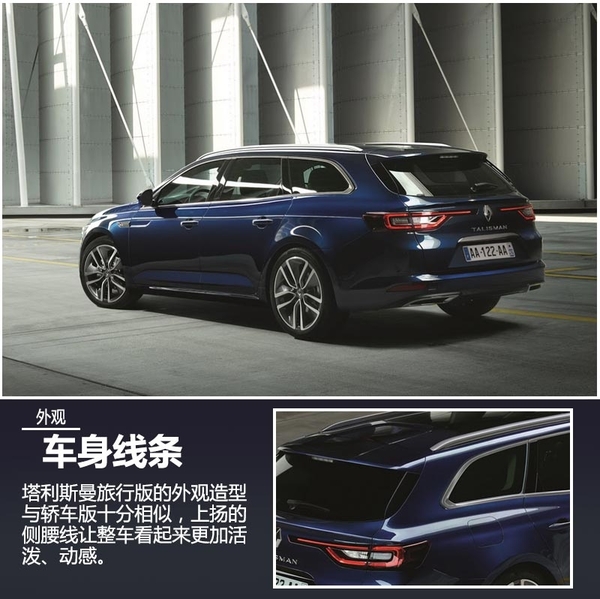 雷诺不久前发布了全新一代中级车塔利斯曼,该车采用雷诺-日产联盟最新的CMF模块化平台打造,将在9月举行的法兰克福车展正式亮相。近日,网通社从雷诺官方获得了塔利斯曼旅行版的图片,在外观上旅行车整体与三厢车保持一致,依旧采用了流线感很强的外观设计。动力方面,新车搭载了1.5T与2.0T两种排量的汽油涡轮增压发动机。据了解,该车与三厢车将一起在9月的法兰克福车展亮相,之后有望以进口车的身份引入国内市场,进入大众迈腾旅行版等车型的细分领域。