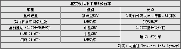 2015年上半年,北京现代累计销量510,276台,其中“D+S”(中高级车型及SUV车型)车型销量占比为42%左右,这与北京现代年初制定的“D+S”车型销量占比达50%的全年目标有一定差距,下半年北京现代将在中高级车型和SUV车型方面集中发力。日前,网通社从北京现代官方了解到:北京现代下半年将推出紧凑型SUV全新途胜、全新胜达2.0T升级改款车型、名图1.6T、ix25 1.6T以及第九代索纳塔混动版共5款新车。5款新车的推出,将为北京现代完成“D+S”车型销量占比达50%的目标奠定坚实基础。