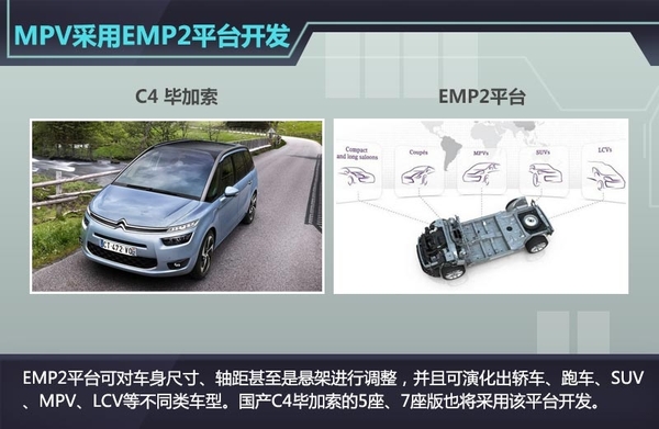 雪铁龙C4毕加索是基于PSA集团最新的EMP2模块化平台打造的一款MPV车型,该平台最大的优势在于可以衍生出不同级别、尺寸、配置的乘用车及商用车。而雪铁龙C4毕加索拥有5座版与7座版,伴随着全新EMP2平台落户成都工厂,雪铁龙C4毕加索也有望成为东风雪铁龙品牌在MPV市场的新产品。