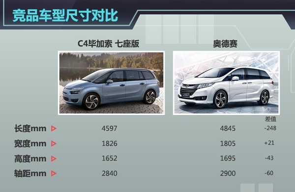 最新推出的C4毕加索7座版,采用了“2+3+2”的座椅布局,值得一提的是,7个座椅均采用了独立的设计,这样的做法在传统MPV中并不多见。车身尺寸上,雪铁龙C4毕加索长宽高分别为4597*1826*1652mm,轴距则达到了2840mm。对比同属MPV车型的本田奥德赛而言,雪铁龙C4毕加索7座版除了在长度上有所差距外,其余几项均与奥德赛车型的数据基本相同,这样的尺寸也保证了车内的空间。