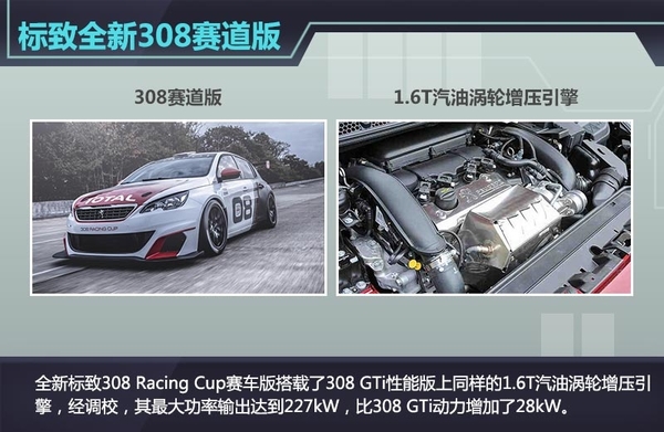 动力方面,全新标致308 Racing Cup赛车版搭载了308 GTi性能版上同样的1.6T汽油涡轮增压引擎,经调校,其最大功率输出达到227kW,比308 GTi动力增加了28kW,随之搭载的传动装置是一款6速自动变速箱。