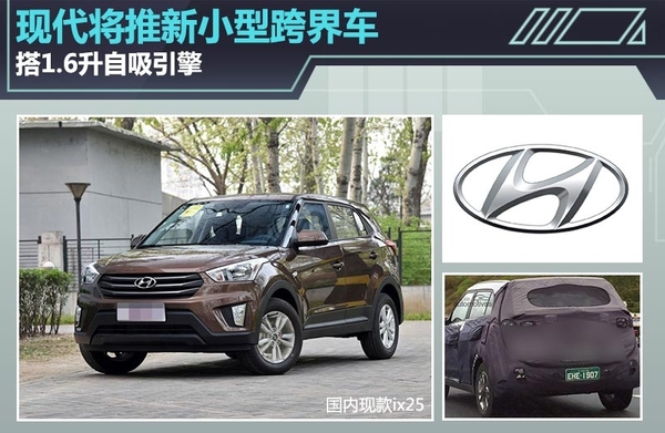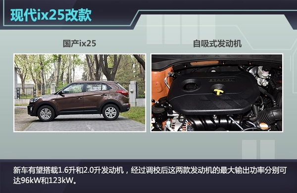 现代Ix25定位为小型SUV,已于2014年4月20日在北京车展上正式发布,并在2014年第三季度上市。作为现代在A0级市场唯一的一款跨界车型,ix25在上市后凭借年轻化的造型和实用的空间设计受到消费者的青睐。国内在售ix25的车身尺寸为4270*1780*1622mm,轴距为2590mm,搭载1.6升和2.0升自然吸气发动机,最大输出功率分别为91.6kW和118kW,匹配6速变速箱。