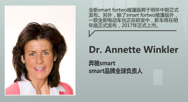 据smart品牌全球负责人Annette Winkler称,全新smart fortwo敞篷版将于明年中期正式发布。另外,除了smart fortwo敞篷版外,一款全新电动车也正在研发中,新车将在明年底正式发布,2017年正式上市。