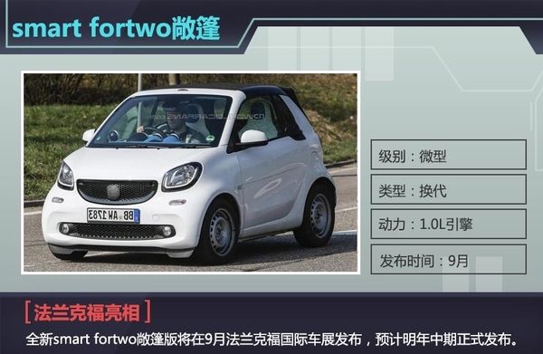 随着法兰克福国际车展的临近,众多即将亮相新车提前曝光。日前,网通社从车迷世界Worldcarfans获悉,smart美国公司高层正式对外宣称全新smart fortwo敞篷版将在9月法兰克福国际车展发布,预计明年中期正式发布。