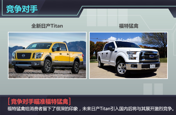 不同皮卡车型有着不同的功能与动力方面的特点。在皮卡市场中,福特猛禽给消费者留下了很深的印象,同时作为引入国内的高端皮卡车型,未来日产Titan引入国内后将与其展开激烈竞争,若全新日产Titan想在皮卡市场中扎稳脚跟,其全新车型势必要具备更好的优势,才能吸引更多消费者的关注。(网通社2015年8月30日北京报道)