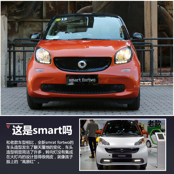 小时候玩过四驱车的,说换龙头、凤尾一定不陌生,儿时的玩具或许一去不复返了,但是长达成人的我们却多了很多新“玩具”,比如smart。这还是smart吗?第一眼看实车的时候还是有些惊讶,仔细看看前脸,除了该有的东西位置没变以外,几乎看不到上一代车型的影子,还好有车标在,时刻提醒你这就是一台smart。