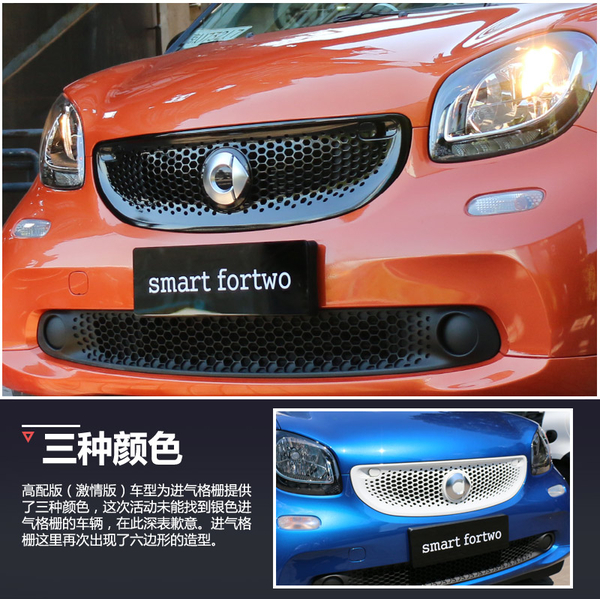 进气隔删的面积明显加大了很多,同时采用了类似奔驰“满天星”的风格,不过和奔驰不同的是,smart这个进气格栅采用了黑色蜂窝网状的设计,视觉效果非常棒,如果你购买的是激情版车型,那么你还可以选择白色或银色的进气格栅,相比黑色的来说运动感略有减少,时尚的元素得以增加。