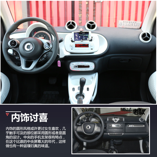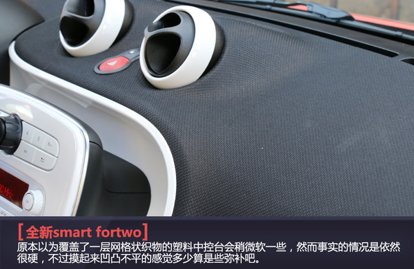 和现款车型略显呆板的内饰设计相比,全新smart fortwo的内饰风格就个性多了,几乎所有看得见的地方都是圆的。