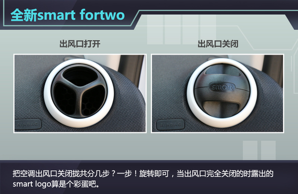 虽然上面只是提炼出三条特点,但是全新smart fortwo内饰的亮点还有很多,我们接着看。中控手机支架的上面就是空调出风口,不用想也是圆的,重点是当你完全关闭出风口(旋转出风口即可)的时候还会出现smart的logo。堵车的时候闲的无聊倒多了一个可以把玩的物件了,但是话说回来,开smart你还会堵车?