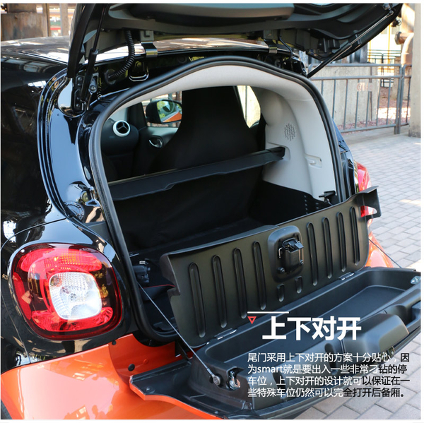 我们都知道smart是后置后驱的布局,全新smart fortwo依然保留了这个经典设计,但是你要是想当然认为传统的发动机舱就腾出来一部分储物空间的话那就你就错了,因为前面并没有储物空间,那么储物空间在哪呢?还是在传统的位置,上下对开的后备厢门很实用,搬大件就全打开,小物件只开上方玻璃即可,非常方便。