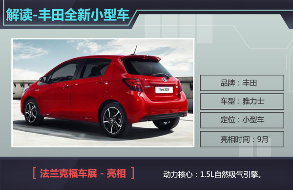 随着能源危机的日渐严重,各大汽车制造商在旗下最新车型的动力总成中均配备了排量更小的引擎,其中丰田旗下即将推出的全新车款不仅配备了小排量引擎,还将融入混合动力系统,以便提升动力及降低油耗。日前,网通社从车迷世界Worldcarfans获悉,丰田将推出全新小型轿车雅力士,新车在动力总成中配备了小排量引擎及混动系统,并于法兰克福车展首度亮相。