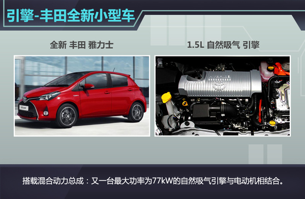 在动力总成中,丰田全新雅力士搭载了一台排量为1.5L的自然吸气引擎,并且配备可变气门正时系统,从而降低其油耗。与此同时由于丰田旗下的混动车型均搭载采用阿特金森循环方式的自然吸气引擎,因此搭载于该车的引擎也将为此规格设计。该设计能够降低引擎的压缩比,从而提升膨胀比,进而在混合动力系统的介入后,发挥动力总成的强劲动力储备。