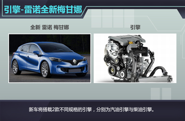 在动力方面,雷诺全新梅甘娜将搭载2款不同规格的引擎,分别为汽油动力及柴油动力。但值得一提的是:虽然柴油引擎的车款无论在油耗还是动力的输出特性方面均由于汽油引擎,但针对中国市场而言,未来引入国内销售的车款将为汽油版车型。