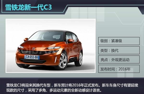 作为一款散发着法式浪漫的小车,雪铁龙C3以其小巧可爱的外观以及小型城市用车定位赢得了都市人的喜爱,随着当代工业社会产品推陈出新的高频率,雪铁龙C3将迎来其换代车型,新车预计将2016年正式发布,且其预览图率先曝光。