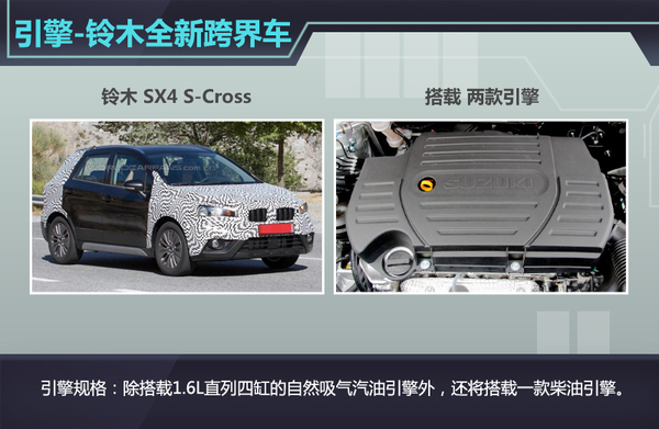 在动力总成中,铃木全新SX4 S-Cross将搭载2套不同规格的动力总成,其中主推的是1.6L排量的直列四缸引擎,该款自然吸气引擎在全力做功时能够爆发出88kW的最大功率,以及156Nm的峰值扭矩。而另一款柴油引擎则能保证在相同功率输出的前提下,将峰值扭矩推升至320Nm。