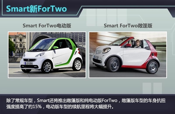 除了常规车型,Smart还将推出敞篷版和纯电动版ForTwo。敞篷版ForTwo使用了包括隔板、高强度钢管在内的多个底盘加强件,车身抗扭强度提高了约15%,定于今年9月在法兰克福车展上亮相。纯电动版ForTwo将使用由LG化学提供的全新电池组,续航里程将大幅提升。(网通社2015年8月31日北京报道)