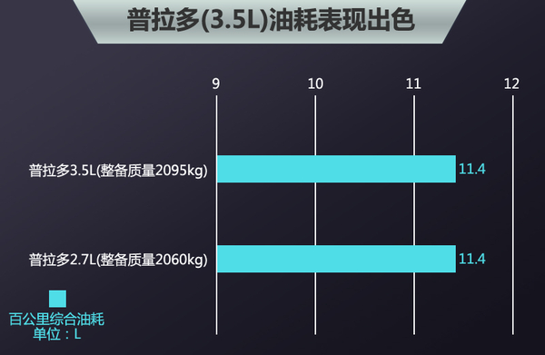 普拉多2.7L车型百公里综合油耗为11.4L,该车整备质量为2060kg,普拉多3.5L车型整备质量为2095kg,相比2.7L车型增加35kg,并且该车排量更大,但是百公里综合油耗与2.7L车型同样为11.4L,这样的表现确实让人眼前一亮,一款动力更强却又更省油的车是当下消费者非常期待的。