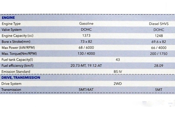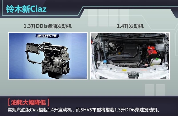动力方面,常规汽油版Ciaz搭载1.4升发动机,最大输出功率为68kW,峰值扭矩为130Nm,匹配5速手动或4速自动变速箱;而SHVS车型将搭载1.3升DDis柴油发动机,最大输出功率为66kW,峰值扭矩为200Nm,配有动能回收系统、启停系统和扭矩辅助系统,燃油效率从26.21 km/L提高至28.09 km/L。