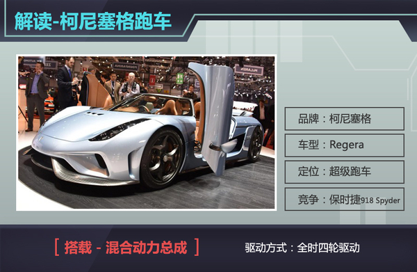 柯尼塞格Regera在外观方面将采用全新设计的前脸造型,新车除采用碳纤维打造外,还整合了轮毂电机,以驱动车辆高速行驶。而全时四驱系统也将使其具有足够的实力竞争混动超跑车型中的领军跑车保时捷918 Spyder。