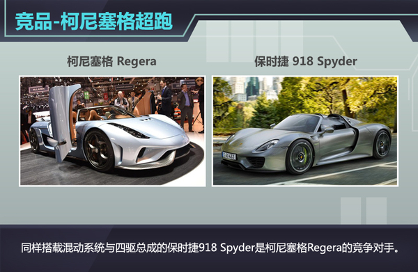 保时捷918 Spyder无疑是当今搭载混合动力总成的超跑代表,虽然同样采用V8引擎作为动力核心,但柯尼塞格Regera所得益于碳纤维车架及覆盖件的应用,将在动力推重比方面占优,而这也将使柯尼塞格Regera有望赶超保时捷918 Spyder所处的超跑集团中的领导性地位。