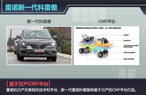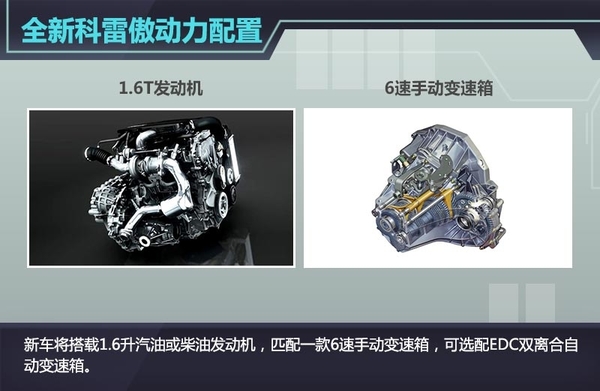 全新科雷傲将基于日产的CMF平台打造,搭载一款1.6升四缸涡轮增压发动机,最大输出功率为120kW,峰值扭矩为240Nm;一款1.6升柴油发动机,最大输出功率为95kW,峰值扭矩为320Nm。新车标配6速手动变速箱,可选配EDC双离合自动变速箱。