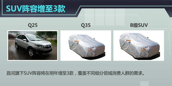 目前国内SUV市场的持续火爆,使得众多车企不断推出新车以期争取更大销量,SUV产品也将成为昌河汽车未来产品投放的重点。昌河汽车高层此前透露,今年年内全新小型SUV(或命名Q25)将正式上市,而定位更高的Q35以及首款B级SUV产品将于明年推出。按此计划,昌河旗下SUV阵容将在明年增至3款,覆盖不同细分领域。