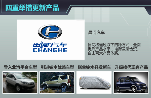 按照此前北汽重组昌河汽车时制定的规划,昌河汽车将通过导入北汽集团双品牌平台车型、引进日本铃木战略车型、联合铃木开发全新车型,升级换代现有产品四种方式,全面提升产品水平,均衡发展合资、自主两大产品体系,产品涵盖从B级车到微车,从轿车到SUV、MPV全系列产品谱系。而此批新车投放市场后,将为昌河汽车发展打下坚实的基础。